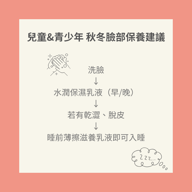 臉部保養是秋冬最需要被照顧的關鍵部位。 孩子的臉長時間暴露在乾冷環境中,很容易缺水。建議建立簡單、孩子也能自己完成的臉部保養流程,讓保濕成為每天的習慣: