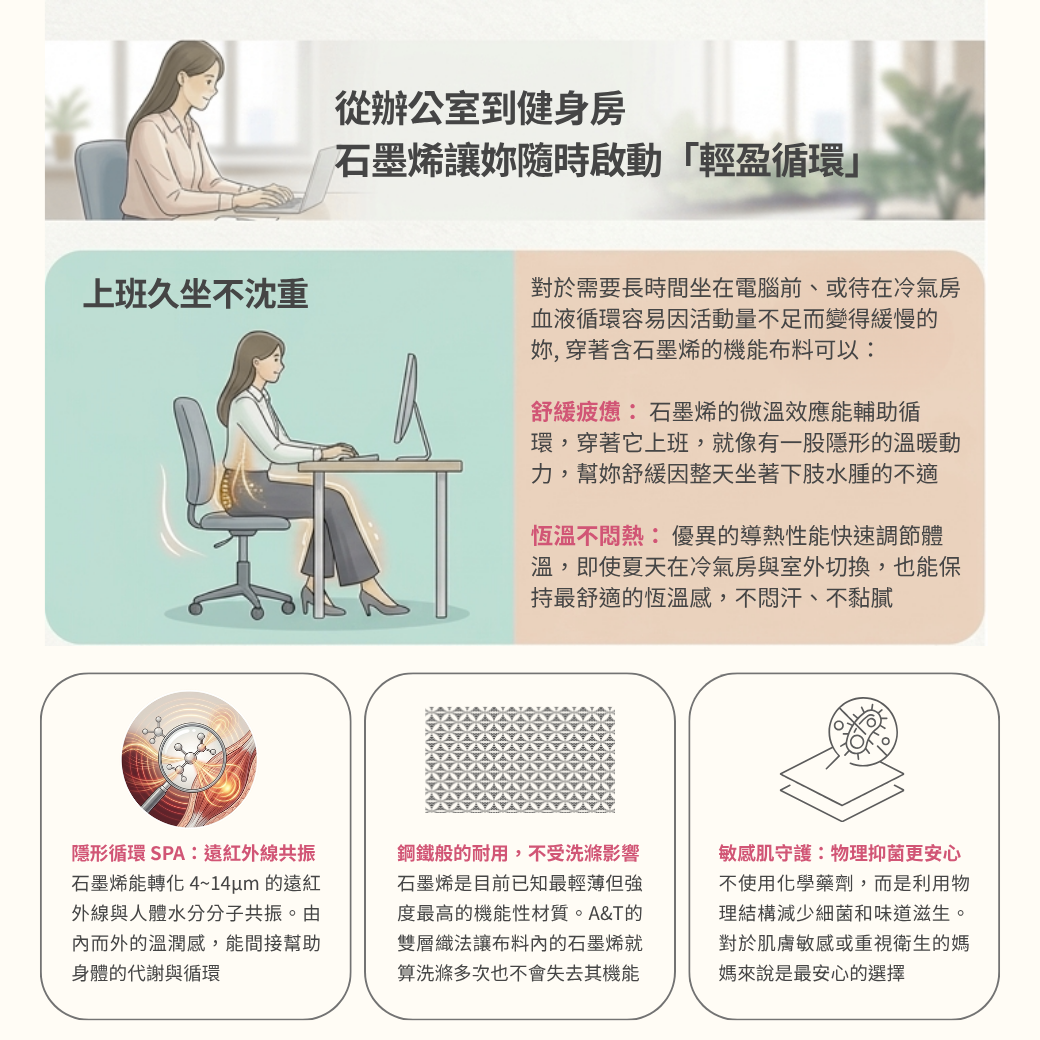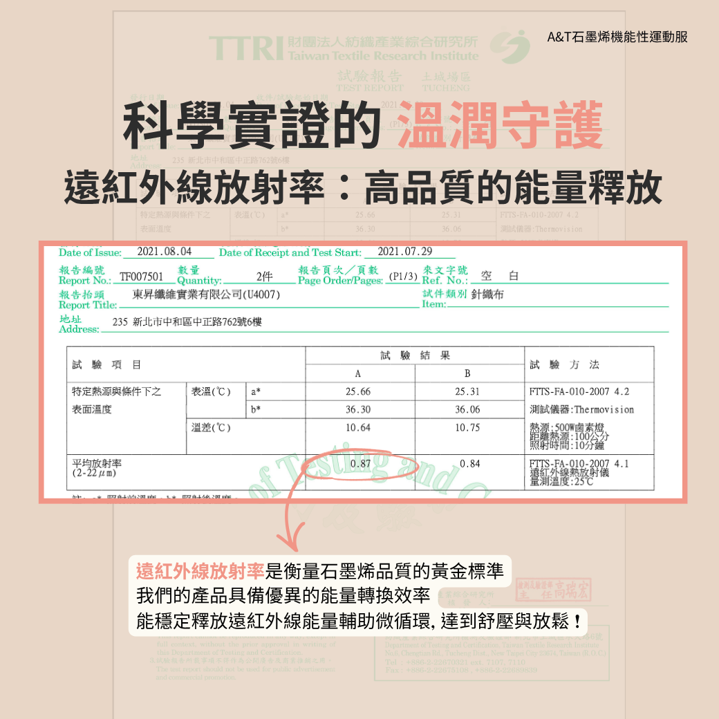 經 TTRI 權威認證,遠紅外線放射率高達 0.87 ,無論是辦公久坐或瑜珈健身,都能啟動身體微循環,享受全天候的溫潤體感