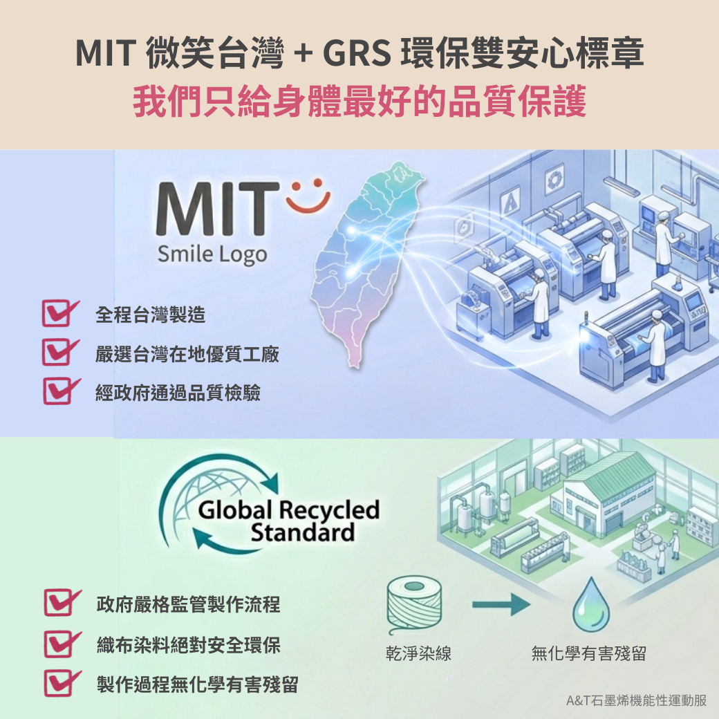 堅持全程台灣製造並獲 MIT 微笑標章與 GRS 環保認證,確保製程與染料安全合法,提供最放心的物理防毒抗菌守護