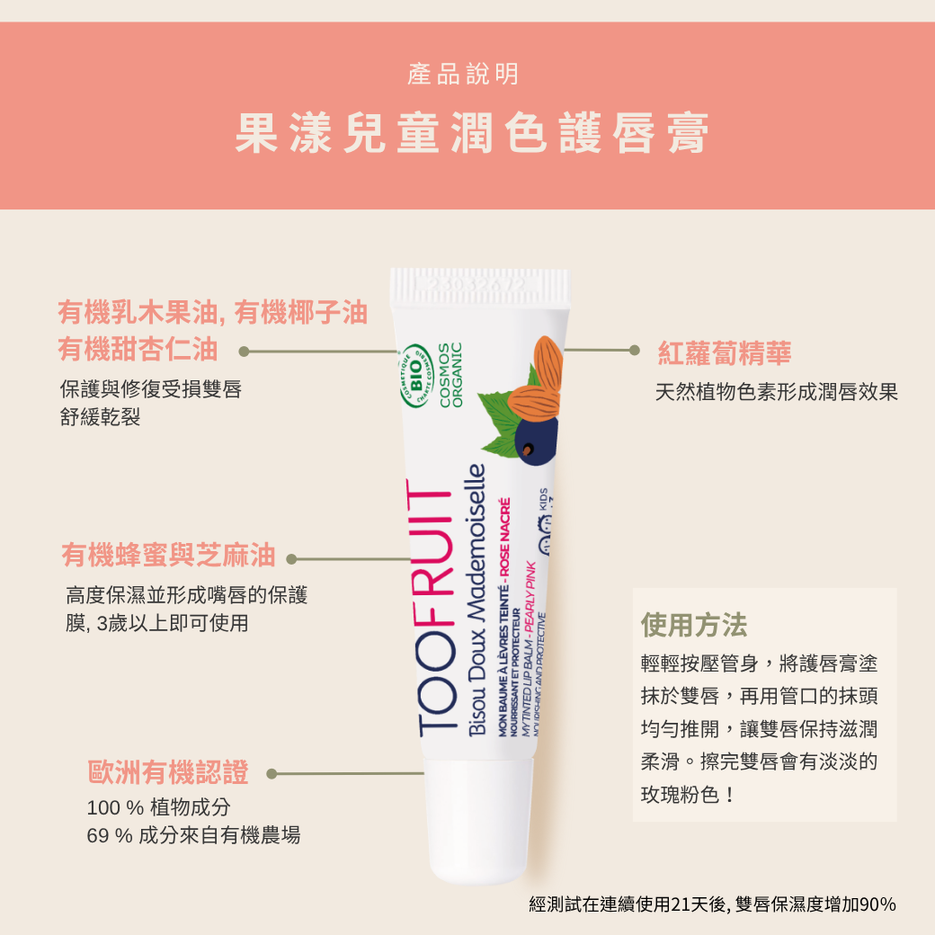 Toofruit 潤色護唇膏:法國兒童保養首選,含乳木果油與天然果油,長效潤澤、輕微顯色