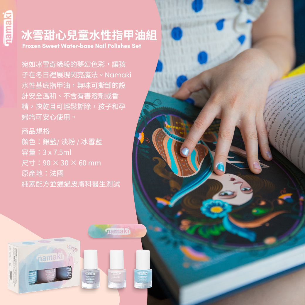 宛如冰雪奇緣般的夢幻色彩,讓孩子在冬日裡展現閃亮魔法。Namaki水性基底指甲油,無味可撕卸的設計安全溫和、不含有害溶劑或香精,快乾且可輕鬆撕除,孩子和孕婦均可安心使用。