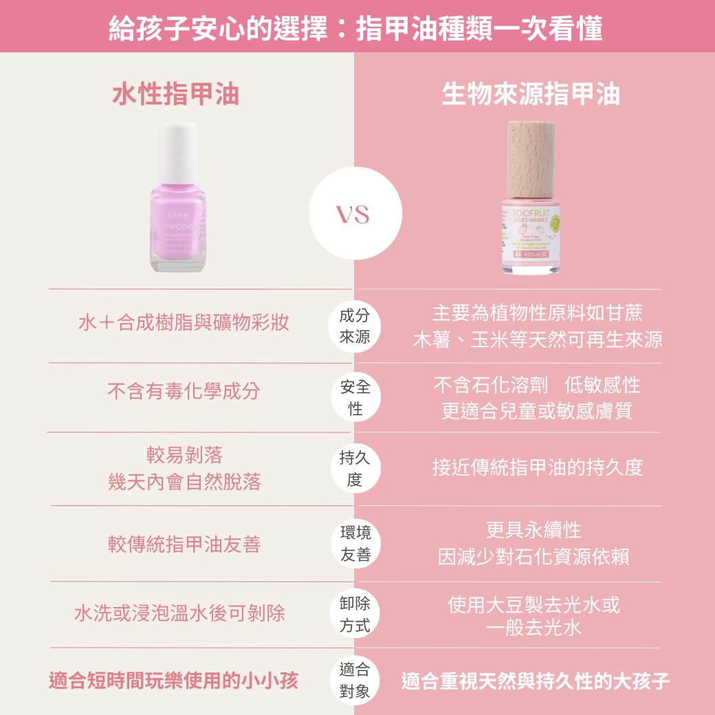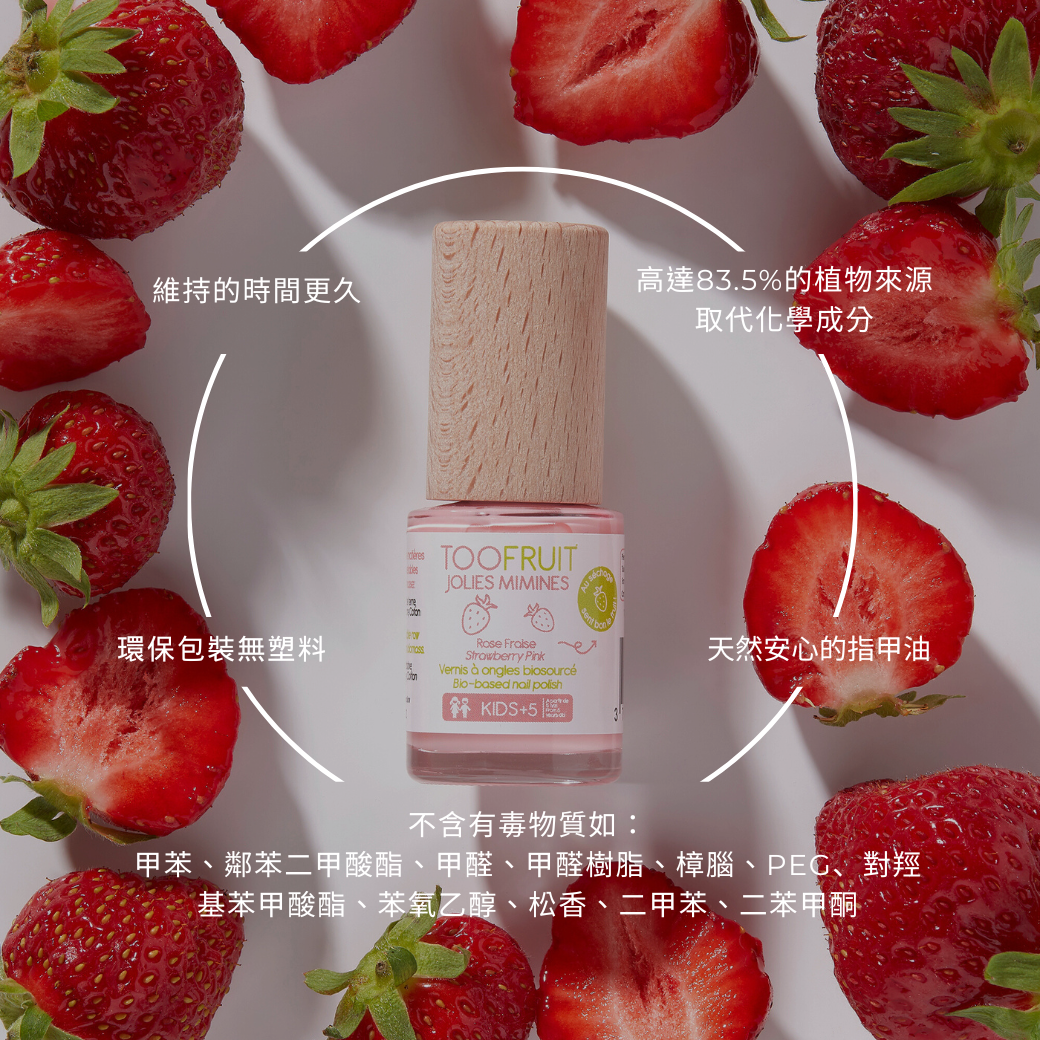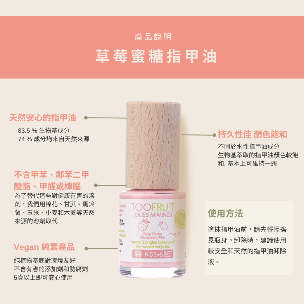 適合兒童使用的指甲油,採用高達83.5% 生物來源取代化學配方,我們使用了馬鈴薯、玉米、小麥、木薯、棉花和甘蔗,部分取代了常用的石化溶劑、塑化劑和硝化纖維素。