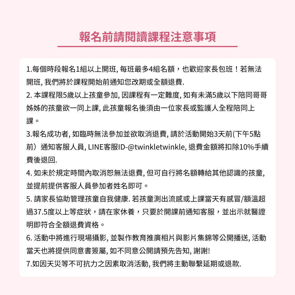 1. 報名成功者, 如臨時無法參加並欲取消退費, 請於活動開始3天前通知客服人員, LINE客服ID@twinkletwinkle, 退費金額將扣除10%手續費後退回.