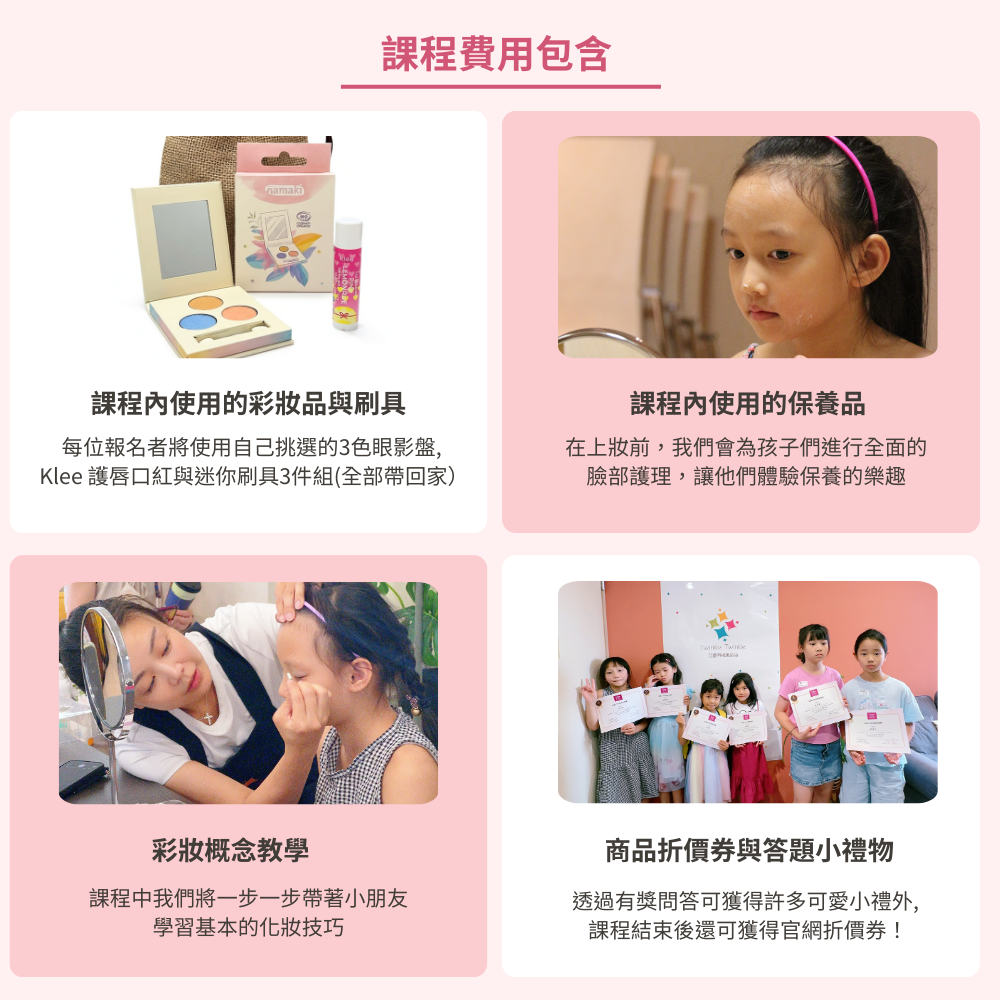 小班制的個人化教學,讓我們能更貼心地根據孩子的不同膚質與需求,調整適合的保養產品。課程中還有驚喜的商品體驗, 讓孩子的玩美時光更豐富。歡迎5歲以上的孩子報名參加,一同開啟這場美麗的旅程!