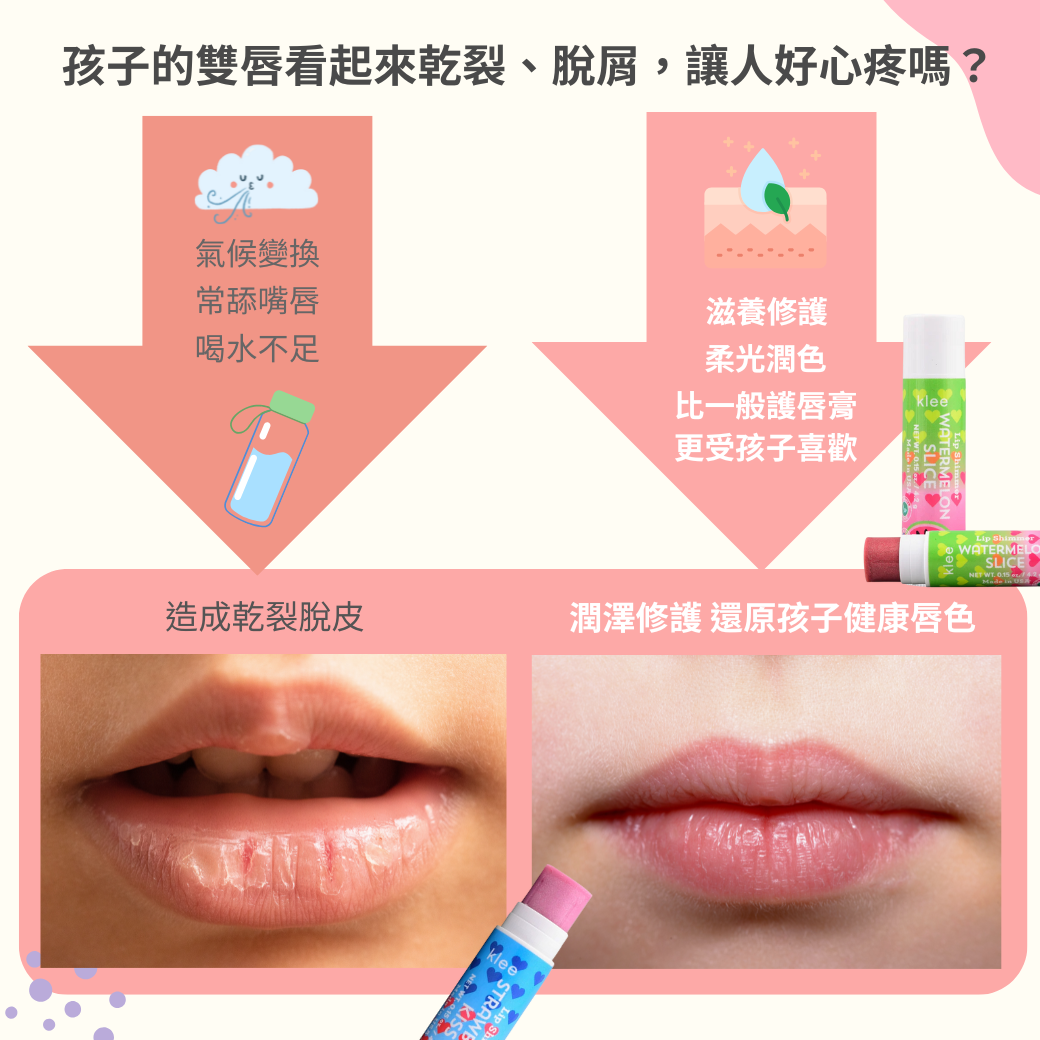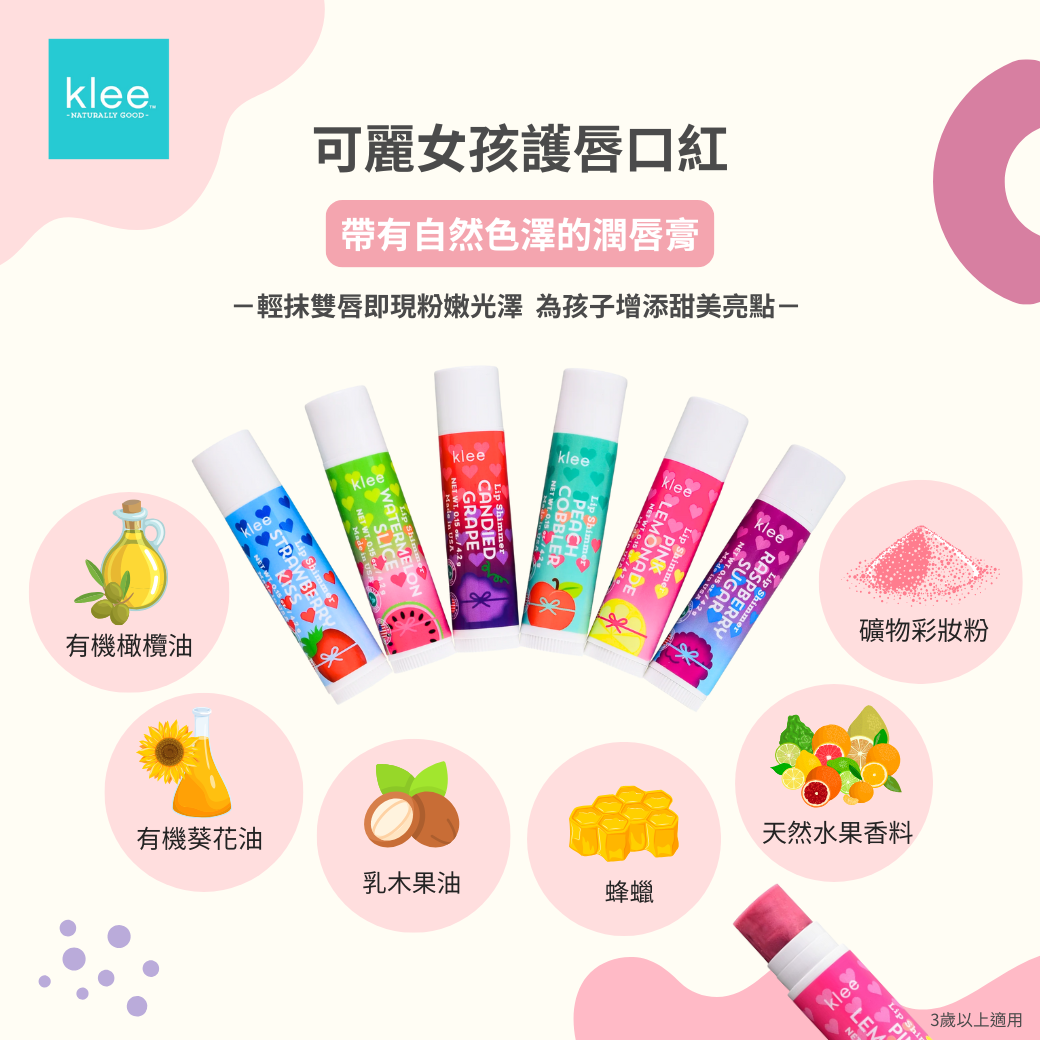KLEE KIDS 兒童口紅, 護唇膏質地, 加入天然礦彩調和顏色, 讓寶貝安心使用.