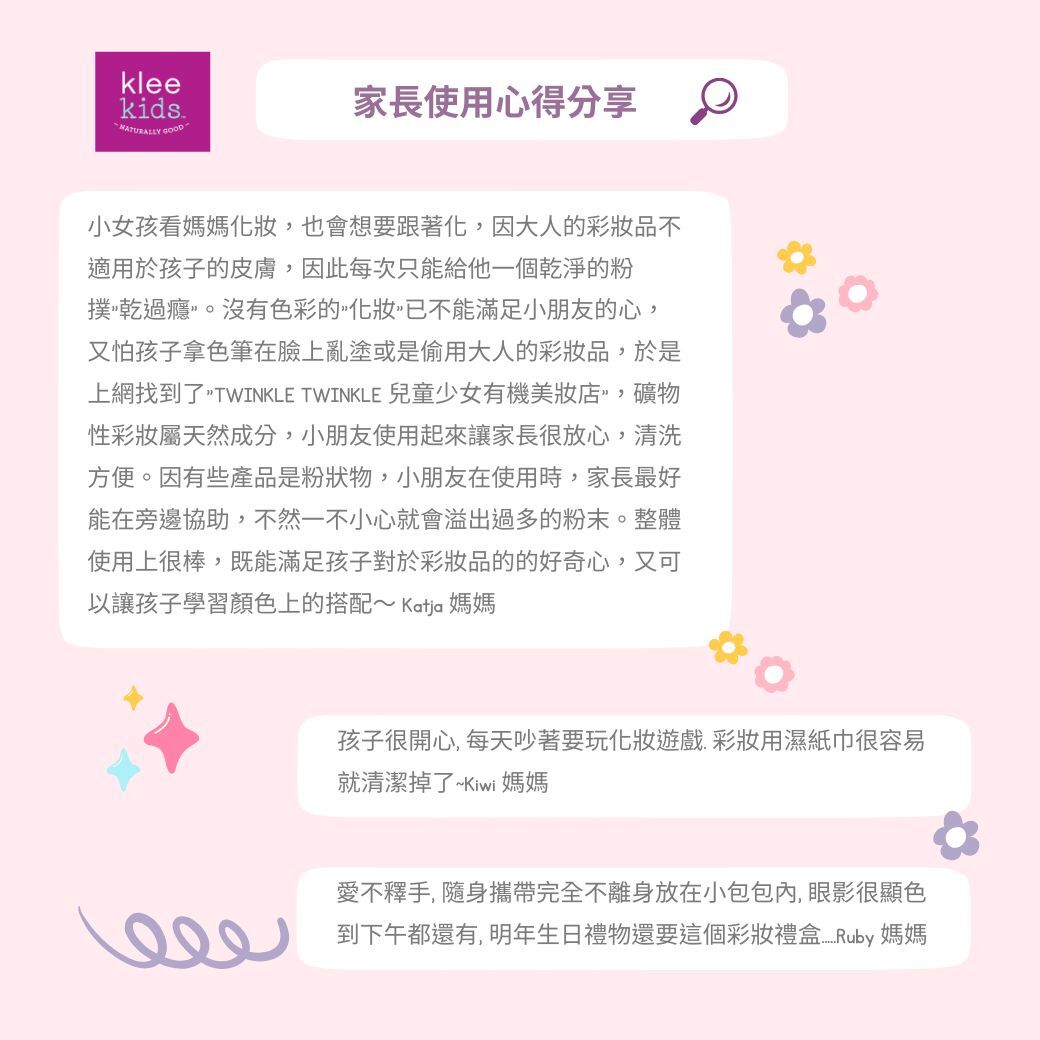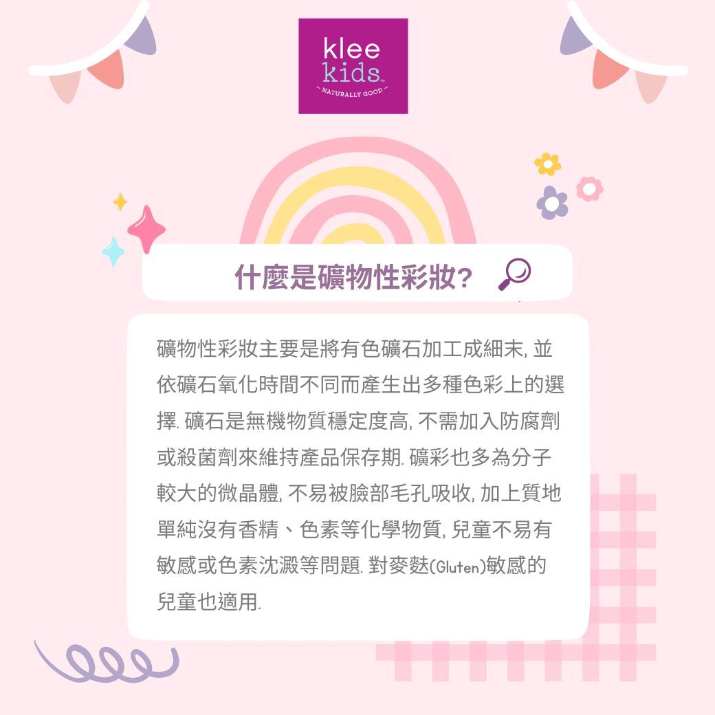 來自美國的Klee Kids 兒童專屬彩妝品捨去一般大人化妝品內有的化學物質,採用礦物彩粉創造出多種讓女孩們看了會心動的美麗顏色. 讓家長們寬心,女孩們也玩得開心!