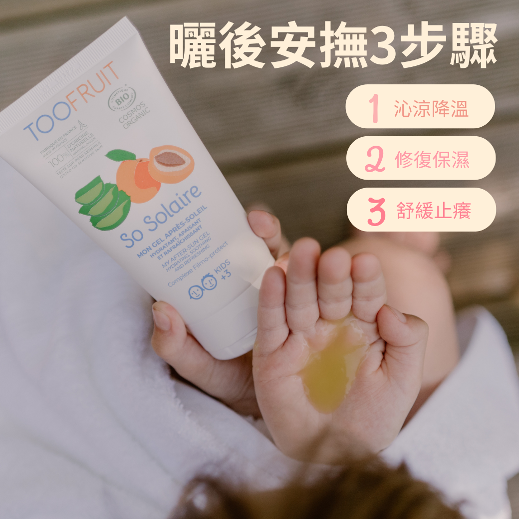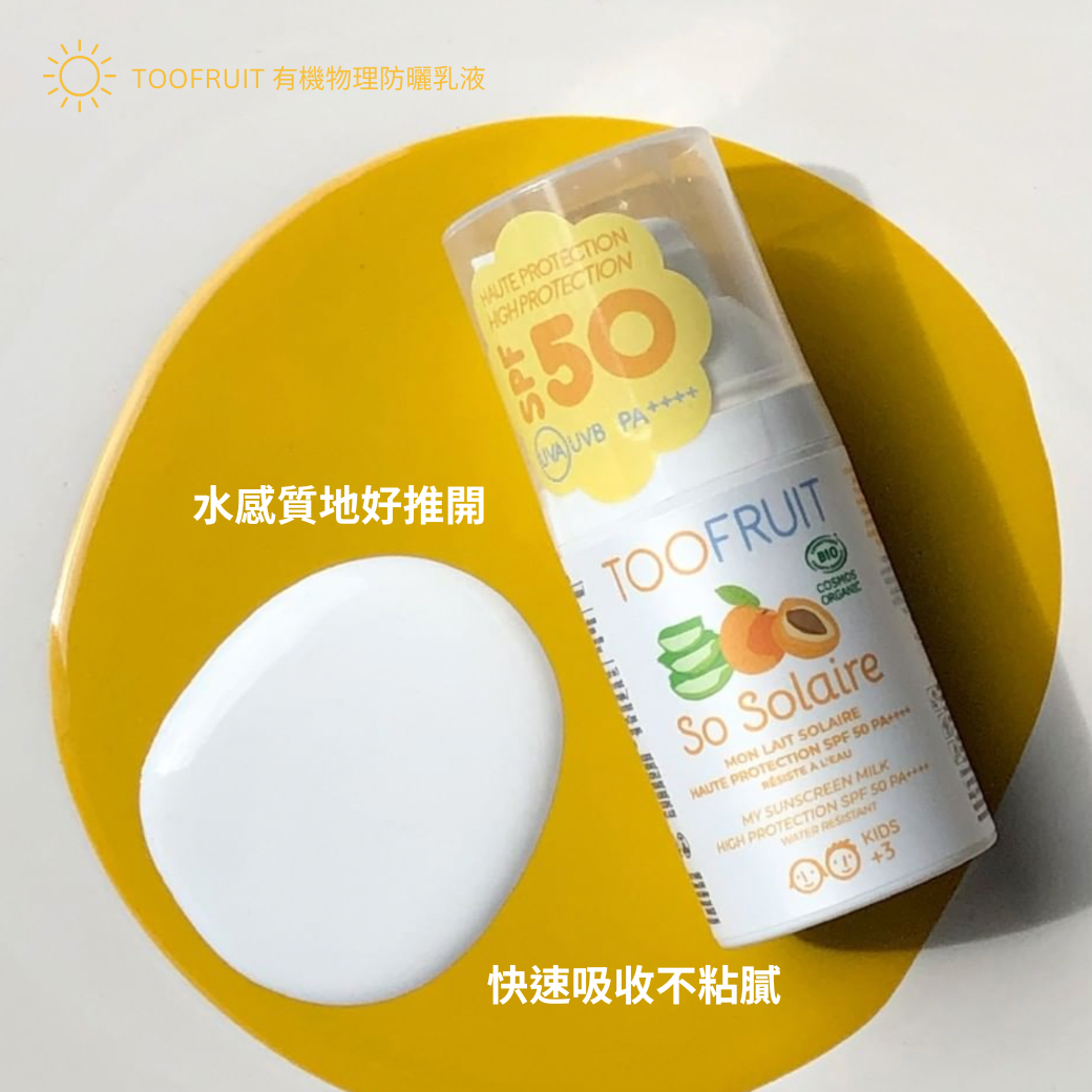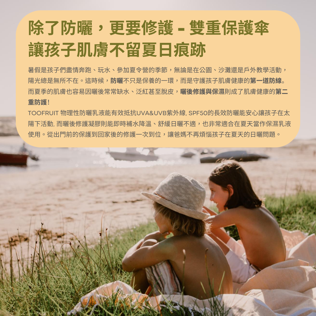 TOOFRUIT 物理性防曬乳液能有效抵抗UVA&UVB紫外線, SPF50的長效防曬能安心讓孩子在太陽下活動, 而曬後修護凝膠則能即時補水降溫、舒緩日曬不適,也非常適合在夏天當作保濕乳液使用。從出門前的保護到回家後的修護一次到位,讓爸媽不再煩惱孩子在夏天的日曬問題。