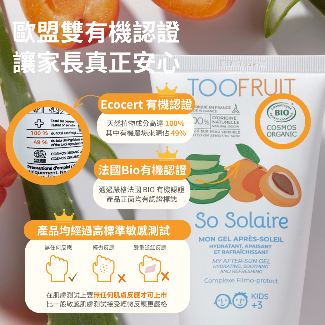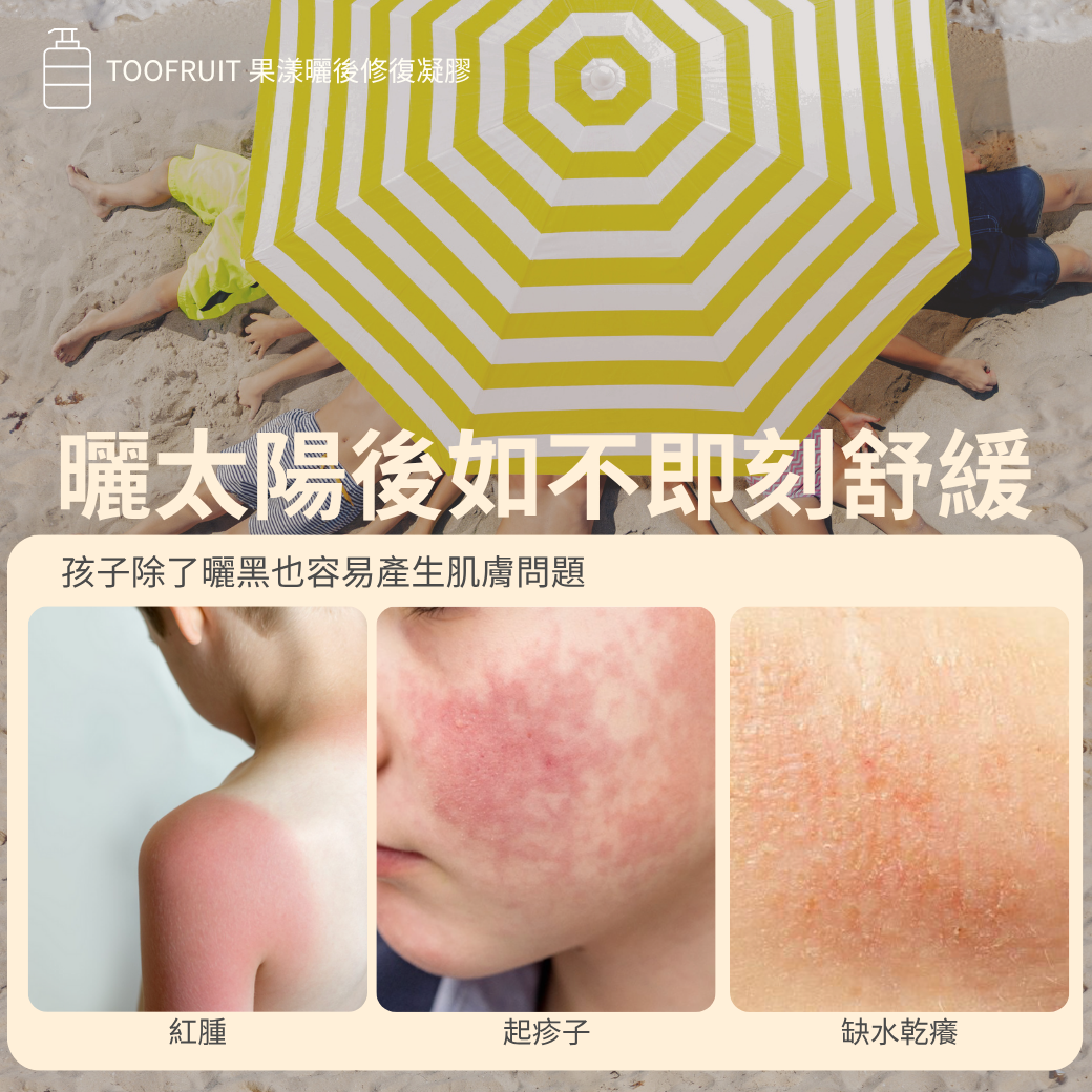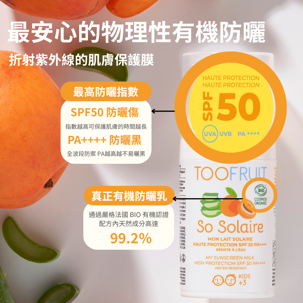 TOOFRUIT 物理性防曬乳液能有效抵抗UVA&UVB紫外線, SPF50的長效防曬能安心讓孩子在太陽下活動, 而曬後修護凝膠則能即時補水降溫、舒緩日曬不適,也非常適合在夏天當作保濕乳液使用。從出門前的保護到回家後的修護一次到位,讓爸媽不再煩惱孩子在夏天的日曬問題。