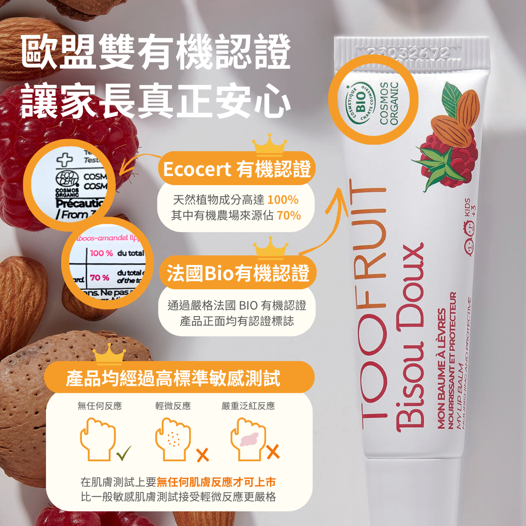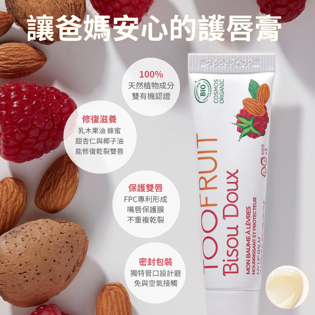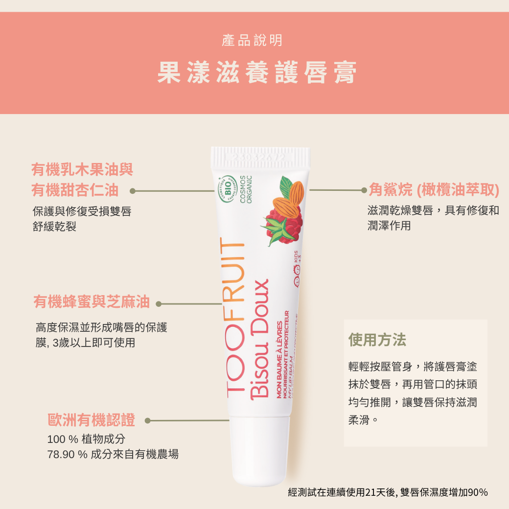 專為兒童設計,無色透明、不僅能滋養雙唇,還能減少乾裂,為孩子們帶來健康的呵護。融合乳木果油,甜杏仁油,蜂蜜等滋養度高的植物油,讓孩子每次塗抹都能滋潤並修復雙唇。Flimo-Protect Complex 品牌專利能在雙唇形成保護膜, 經測試在連續使用21天後可明顯感受不同, 孩子唇部保濕度增加90%!100%植物成分, 其中70%來自有機農場, 是讓爸媽安心的護唇膏!