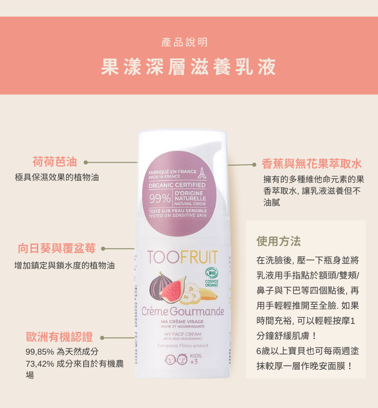 結合香蕉擁有的多種維他命元素 與TooFruit的植物油脂專利成分, 是質地非常滋養的乳液但擦後卻不油膩. 淡淡的水果香適合乾性肌膚或需要額外加強保濕的孩子使用, 一週一次可作為滋養晚安面膜