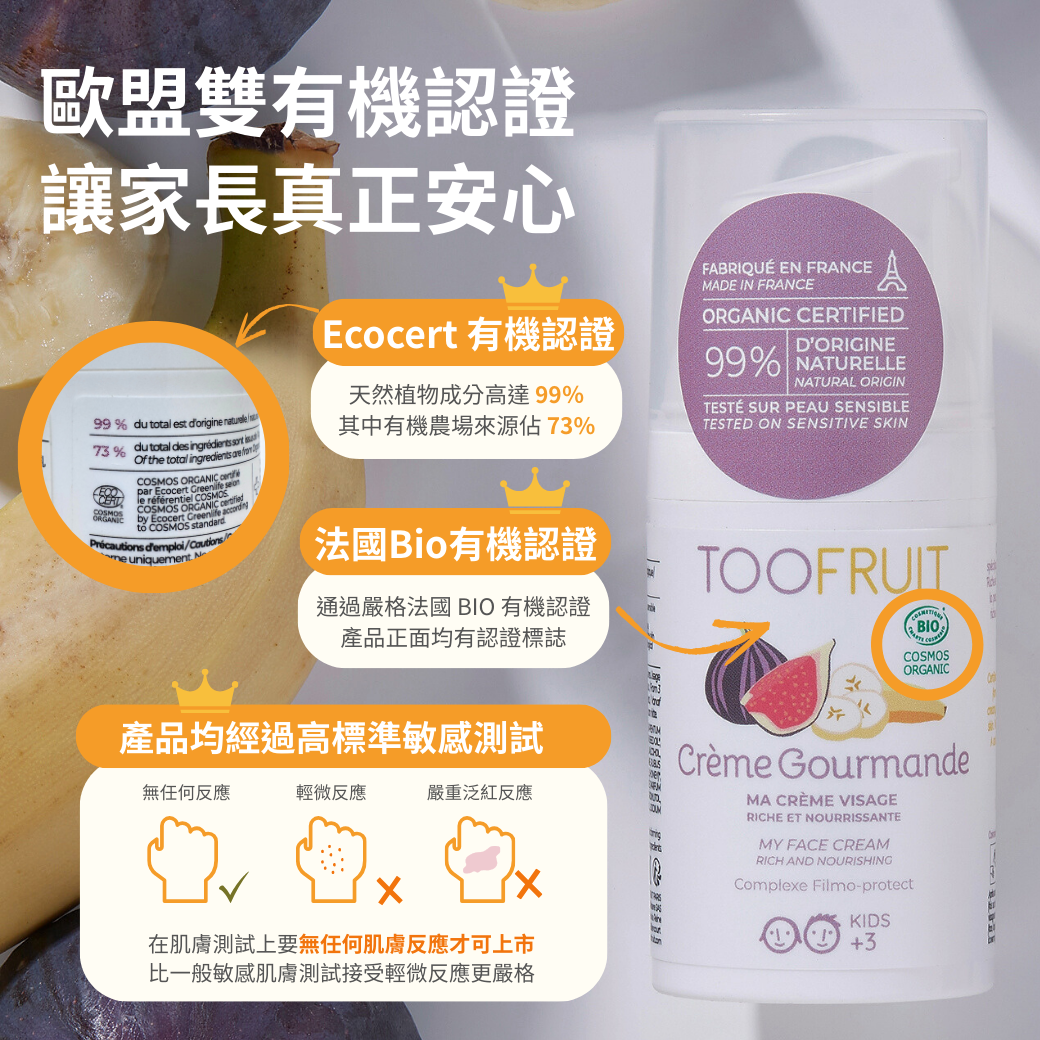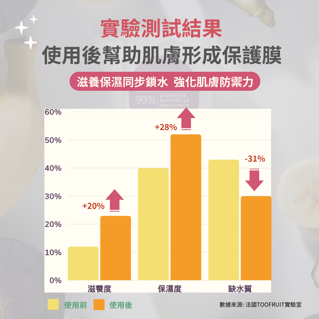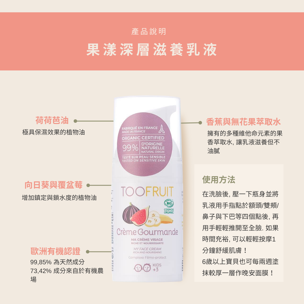 結合香蕉擁有的多種維他命元素 與TooFruit的植物油脂專利成分, 是質地非常滋養的乳液但擦後卻不油膩. 淡淡的水果香適合乾性肌膚或需要額外加強保濕的孩子使用, 一週一次可作為滋養晚安面膜