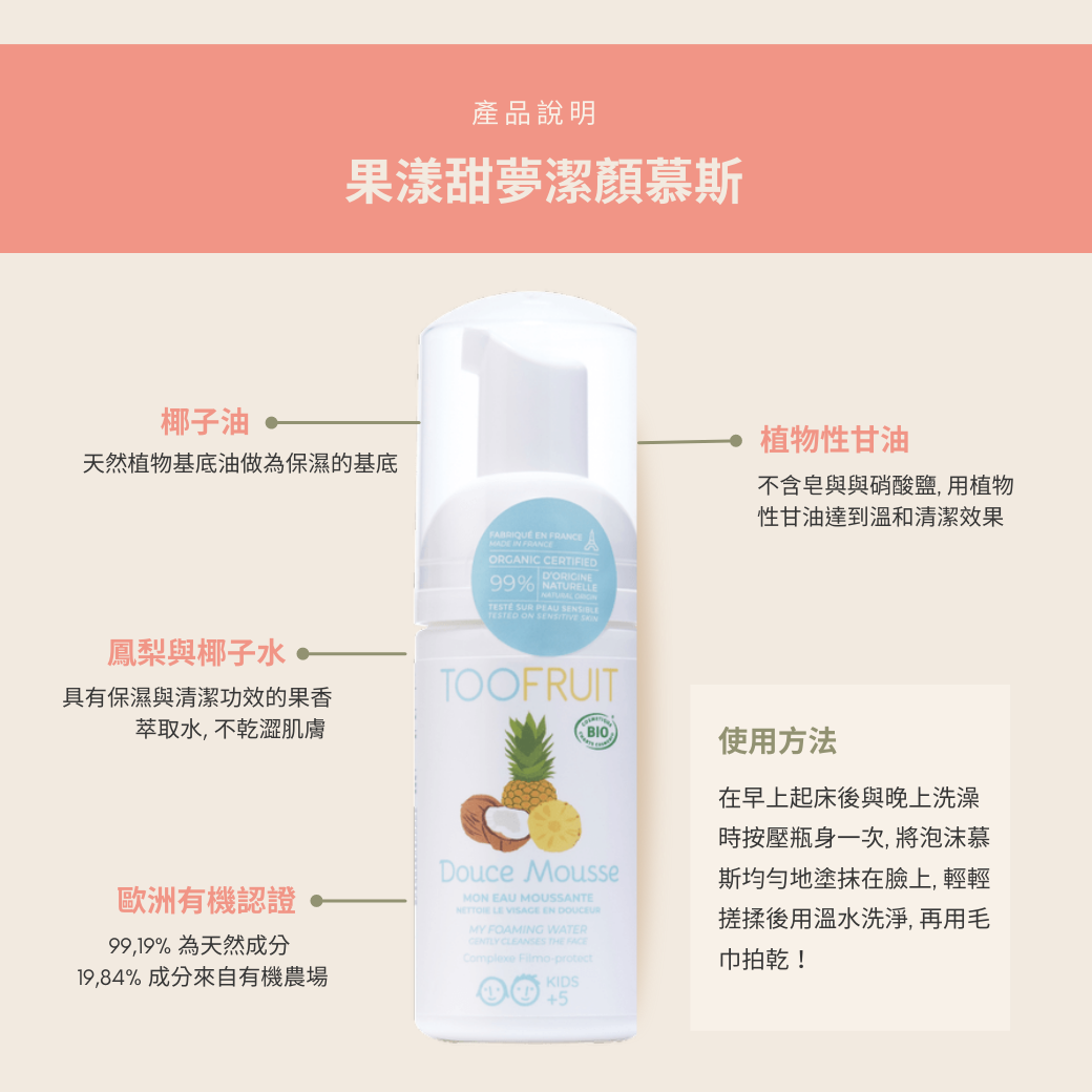 不含皂及硫酸鹽的兒童洗臉慕斯, 運用鳳梨與椰子內的清潔保濕功效, 加上TOOFRUIT專為孩子研發的『植物油脂專利成分』, 能溫和潔淨肌膚而不帶繃緊感覺,徹底卻溫和的去除孩子臉上的污垢及雜質,甜美的果香令每次洗臉都變成愉快的體驗.