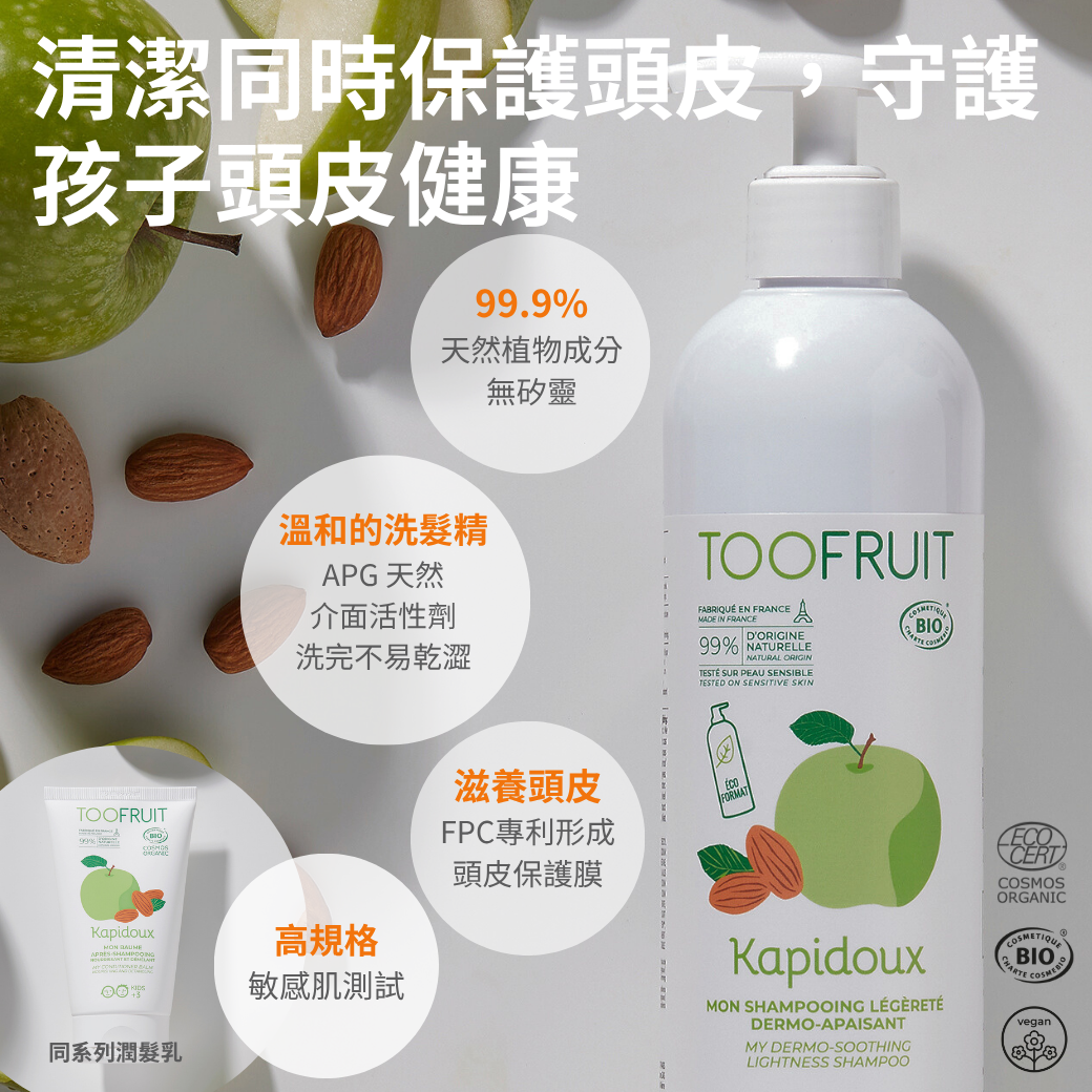 孩子細軟的髮絲常因為戶外活動、日曬或缺水而變得糾結毛躁嗎?專為女孩設計的秀髮呵護組,結合了 Toofruit 果漾青蘋洗髮精與乾濕兩用護髮噴霧,精準修護極細易打結或缺水髮質。