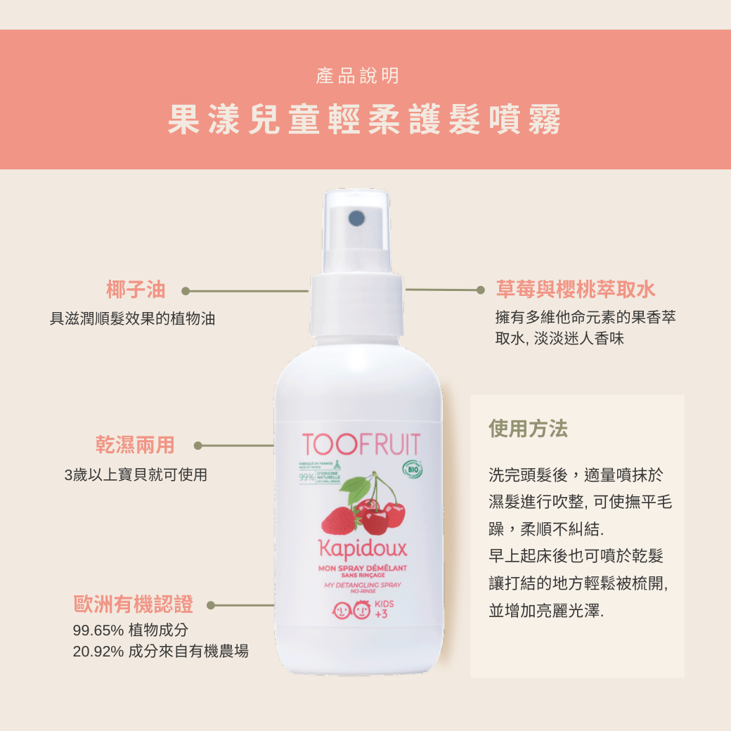 從洗髮時的溫和淨化,到浴後輕輕一噴的長效滋養,讓髮絲瞬間恢復柔順光澤。不再擔心梳頭時的拉扯疼痛,讓孩子在清新的果漾香氣中,重新愛上梳髮打扮的每一刻!