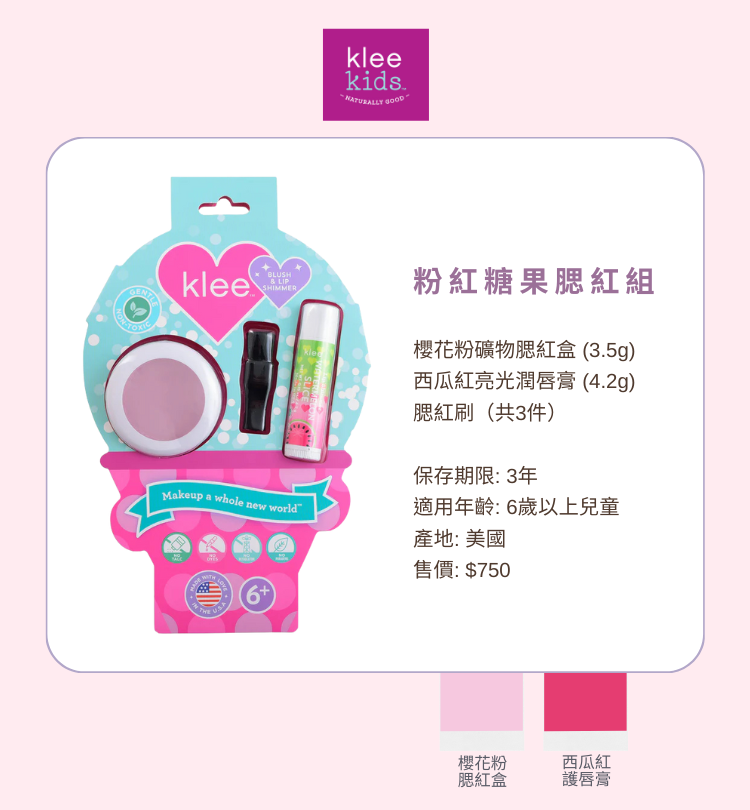 不含一般化妝品中可能堵塞毛孔的有害化學成分,專為女孩設計的安心彩妝入門款。柔嫩的櫻花粉礦物腮紅搭配自然的西瓜紅唇彩,只需兩件商品就能輕鬆打造好氣色,適合6至14歲的小女孩和青少女使用,讓她們安心體驗自信與美麗!